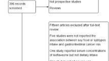 We searched on PubMed, Embase and Cochrane library from their dates of inception to March 2019 for prospective studies examining the association between soy intake and breast cancer. Studies using concentrations of isoflavones or their metabolites in biological samples were not included owing to the difficulty in converting biological concentration into amount of soy isoflavone intake. However, we believed that this had no great impact on the result because studies using biological concentrations as exposure assessment were mainly conducted among populations with pretty low level of soy intake [14, 16, 19]. We excluded studies if the amount of soy intake was unavailable and could not be estimated using relevant data. We also excluded reviews, non-human studies, abstract-only publications or editorials. If the same cohort study published more than one original articles on soy intake and breast cancer, the paper reporting the largest sample size, longest follow-up time, or the widest variation in soy intake levels was kept. In addition, studies in which participants’ soy intake levels were very low (i.e. mean or median intake < 5 mg/day of soy isoflavone for the highest consumption group) were not included in the quantitative synthesis (dose–response meta-analysis) as the weights contributed by these studies were negligible. Detailed literature searching strategy, data extraction methods, and quality assessment of individual study were presented in Appendix.