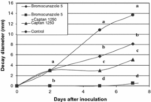 The sterol biosynthesis inhibitors bromuconazole and difenoconazole and tank mixes of each fungicide with captan were applied to apples and evaluated as controls for moldy-core and fruit decay caused by Alternaria alternata. Effectiveness of a mixture of bromuconazole and captan in controlling colonization by the fungus was also evaluated. Decay formation by A. alternata on mature detached fruits was partially inhibited by bromuconazole at 0.5 μg ml−1 and was completely inhibited at 50 μg ml−1; it was significantly affected by either bromoconazole at 5 μg ml−1 or captan at 1,250 μg ml−1, and was completely inhibited by their mixture. In general, three foliar applications of bromuconazole or difenoconazole in the field, during the bloom period, reduced the numbers of infected fruits by 40–60% compared with untreated control trees. However, tank mixes of either fungicide with captan improved control of moldy-core in fruits at harvest. Tank mixtures of bromuconazole and captan also significantly reduced the percentage of fruits colonized by A. alternata when sampled at various days after full bloom. Artificial inoculations in the orchard at full bloom did not change the inhibitory effects of the tank mixtures. Large-scale demonstration trials in commercial orchards supported these findings. The inhibitory effects of tank mixes on decay development in detached fruits, and on moldy-core in the field indicate that a control programme based on mixtures of either bromuconazole or difenoconazole with captan during the bloom period can effectively reduce moldy-core on Red Delicious apples.