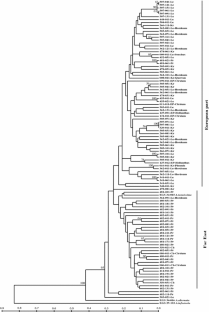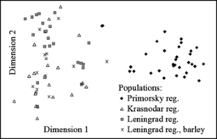 Alternaria tenuissima is a common pathogen on a number of plants described in several geographic regions of the world. Genetic variation within and between Russian Far East, North West and Caucasus populations of A. tenuissima from wheat was examined. In addition, genetic differences between isolates from various hosts were estimated. In total, 101 isolates of A. tenuissima were studied using amplified fragment length polymorphism (AFLP) with four primer combinations. Wright’s fixation index (F st), gene flow (N m) and gene diversity (H s) were calculated. AFLP banding patterns indicated significant genetic distance and at the same time a low level of gene flow between the Far East and the two other groups of isolates originating from the European part of country. The degree of similarity between the North West and Caucasus populations was very high, as was the migration rate. Isolates analysed by UPGMA-based cluster analysis were grouped according to location of origin but irrespective of plant host. Based on the F st value, the group of isolates originating from wheat and barley were not found to differ significantly from each other.