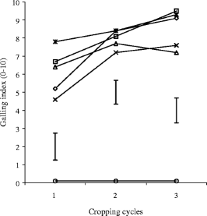 Initial applications of 104 spores g−1 of Pasteuria penetrans, and dried neem cake and leaves at 3 and 2% w:w, respectively, were applied to soil in pots. Juveniles of Meloidogyne javanica were added immediately to the pots (500, 5,000 or 10,000) before planting 6-week-old tomato seedlings. The tomatoes were sampled after 64 days; subsequently a second crop was grown for 59 days and a third crop for 67 days without further applications of P. penetrans and neem. There was significantly less root-galling in the P. penetrans combined with neem cake treatment at the end of the third crop and this treatment also had the greatest effect on the growth of the tomato plants. At the end of the third crop, 30% of the females were infected with P. penetrans in those treatments where spores had been applied at the start of the experiment. The effects of neem leaves and neem cake on the nematode population did not persist through the crop sequences but the potential for combining the amendments with a biological control agent such as P. penetrans is worthy of further evaluation.