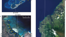 Solar irradiance has been increasingly recognized as an important determinant of bleaching in coral reefs, but measurements of solar radiation exposure within coral reefs have been relatively limited. Solar radiation dosimetry within multiple coral reef areas of South Florida was assessed using remote sensed, modeled, and measured values during a minor bleaching event during August 2005. Coral reefs in the Dry Tortugas and Upper Keys had similar diffuse downwelling attenuation coefficients (Kd, m−1), whereas Kd values were significantly greater in the Middle and Lower Keys. Mean 1% attenuation depths varied by reef region for ultraviolet B (UVB; 9.7 to 20 m), ultraviolet A (UVA; 22 to 40 m) and visible (27 to 43 m) solar radiation. Solar irradiances determined from remote sensed data were significantly correlated with measured values, but were generally overestimated at the depth of corals. Solar irradiances modeled using an atmospheric radiative transfer model parameterized with site specific approximations of cloud cover showed close agreement with measured values. Estimated daily doses (W h/m2) of UVB (0.01–19), UVA (2–360) and visible (29–1,653) solar radiation varied with coral depth (2 to 24 m) and meteorological conditions. These results indicate large variation in solar radiation dosimetry within coral reefs that may be estimated with reasonable accuracy using regional Kd measurements and radiative transfer modeling.