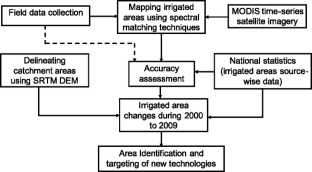 The spatial distribution of temporal irrigated agricultural area was derived at high accuracy from MODIS time series data using a combination of methods consisting of spectral matching techniques and intensive field plot information. Results contribute to spatial information about temporal changes in irrigated areas where regulation of water use and remediation measures should be taken up. This may result in suggesting new cropping pattern and alternative water management practices from field level to sub-basin level.