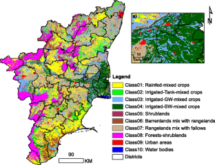 Interannual variation in rainfall throughout Tamil Nadu has been causing frequent and noticeable land use changes despite the rapid development in groundwater irrigation. Identifying periodically water-stressed areas is the first and crucial step to minimizing negative effects on crop production. Such analysis must be conducted at the basin level as it is an independent water accounting unit. This paper investigates the temporal variation in irrigated area between 2000–2001 and 2010–2011 due to rainfall variation at the state and sub-basin level by mapping and classifying Moderate Resolution Imaging Spectroradiometer (MODIS) 8-day composite satellite imagery using spectral matching techniques. A land use/land cover map was drawn with an overall classification accuracy of 87.2 %. Area estimates between the MODIS-derived net irrigated area and district-level statistics (2000–2001 to 2007–2008) were in 95 % agreement. A significant decrease in irrigated area (30–40 %) was observed during the water-stressed years of 2002–2003, 2003–2004, and 2009–2010. Major land use changes occurred three times during 2000 to 2010. This study demonstrates how remote sensing can identify areas that are prone to repeated land use changes and pin-point key target areas for the promotion of drought-tolerant varieties, alternative water management practices, and new cropping patterns to ensure sustainable agriculture for food security and livelihoods.