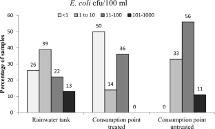 Chidamba, L., & Korsten, L. (2018). Relative proportions of E. coli and Enterococcus spp. may be a good indicator of potential health risks associated with the use of roof harvested rainwater stored in tanks. Environmental Monitoring and Assessment, 190(177), 177. https://doi.org/10.1007/s10661-018-6554-1.