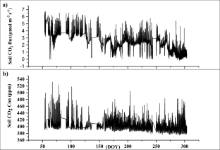 The diurnal and seasonal variation of soil carbon dioxide (CO2) flux was measured in the Pichavaram mangrove forest, the Southeast coast of India from February 2016 to October 2016 using an automated soil CO2 flux chamber system. Maximum soil CO2 efflux reached at 14:00 h and minimum at 00:00 h. The surface soil CO2 concentration ranged from 375 to 532 ppm with the mean 405 ± 18 ppm. The daily soil CO2 flux varied from near zero to about 7 μmol m−2 s−1 with a mean value of 2.4 ± 1.3 μmol m−2 s−1. The highest seasonal CO2 efflux from soil was during the summer and premonsoon seasons, whereas low flux values were recorded during the monsoon season. Soil CO2 efflux values were highly correlated with soil temperature. Tidal inundation during monsoon season, extreme drought condition in summer, and unusual precipitation are the major factors controlling the soil CO2 flux.
