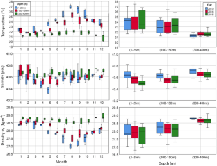 This research investigated physical (temperature, salinity, and density) and chemical (dissolved oxygen, ammonium, nitrate, nitrite, phosphate, and silicate) properties of offshore seawater in the Red Sea northern Gulf of Aqaba; Jordanian Site were measured during 2013–2015 to assess the temporal and seasonal variation of the upper 400 m of the water column. The study also investigated seasonal variations, assessing the relationships of temperature with physical and chemical parameters. The average value of temperature for all data was 23.03 ± 1.58 °C. Temperature followed an expected seasonal cycle during 2013–2015, with well-mixed conditions in the upper 400 m of the water column during spring (Feb–Apr) and stratification during summer (Jul–Aug). There were no significant differences among years for temperature, but highly significant differences among months and depths. The average value of salinity (psu) for all data was 40.60 ± 0.10 with significant positive or negative differences among years, months, and depths. In general, dissolved oxygen, ammonium, nitrate, nitrite, and phosphate data showed positive or negative significant differences among months and depths with no significant annual variations. Silicate only showed significant differences among depths. Correlation tests between temperature and other parameters in the upper 25 m of the water column revealed significant inverse-relationships between temperature and all other parameters (other than salinity) that were attributed to the dominant thermal controls on seawater density, to the thermodynamic controls on oxygen solubility and to seasonal increases in light irradiance that allowed nutrient consumption by primary producers. In the intermediate water column (100–150 m), similar correlations were found as in the 0–25 m data, except for silicate. In the deeper waters (300–400 m), only salinity, density, and phosphate showed significant correlations with temperature, and indicated that the seasonal effects of primary production at depth were minimal. In general, the values of all parameters during the years 2013–2015 in the upper 400 m were comparable with previous studies (e.g., 1998–2003). In conclusion, this research manifested the strong correlation of temperature with some chemical parameters and presumed seasonal controls on primary production. Given the general lack of interannual variation, water quality in the northern Gulf of Aqaba appears relatively stable.