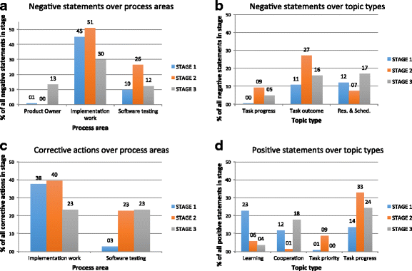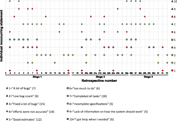 Based on the results presented in this section, we conclude that the discussion topics varied over time and they also reflected the evolution of the development organisation. In a longitudinal analysis, stage 1 represents a small software organisation with only one development team. The organisation adopted Scrum at the beginning of the observation period. The retrospective discussions focused on instructions, learning, cooperation and tools — logical topics for an incipient software organisation. During stage 2, the organisation consisted of two software development teams and faced the challenge of rapid growth during the second year. In comparison to stage 1, the retrospective discussions emphasised task outcome and task progress. In terms of the task outcome, the team members started to discuss the increasing number of software defects; they often mentioned the problem of ‘a lot of bugs’. They also repeated the negative statement on task progress: ‘too much to do’. Furthermore, stage 2 discussions rarely referred to positive experiences regarding task completion or progress. These problems eventually drove the organisation to lengthen the sprints to 3 weeks. During stage 3, the organisation had six teams and the duration of the sprints was further lengthened to 4 weeks by adding one additional week for testing. During that time, the recurring discussions on the high amount of bug fixing and open defects ended. During stage 3, the retrospective topics included somewhat similar topic types as in stage 2, but cooperation became a common topic type once again. Positive experiences with software testing also became more common. Additionally, the team members kept repeating the following points: ‘I got help when I needed it’ and I ‘completed all tasks’. The statements reflect positive software engineering experiences important for the successful development work.