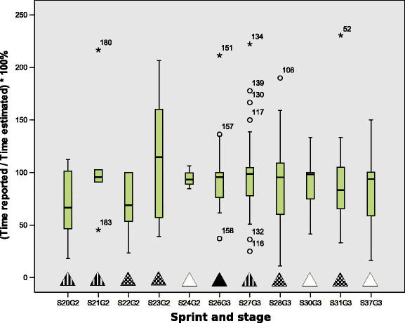 Boxplot of the actual task estimation accuracy vs. the outcomes from retrospectives for the development sprints. Notation on x-axis: SxxGy = Sprint number xx stage y. Triangles: striped = ‘good estimates’; checkerboard = ‘efforts were not accurate’; black = both statements were made; white = no statement regarding the estimates (the circles denote outliers and the stars extreme outliers)