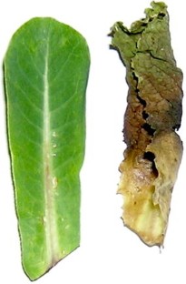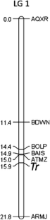 Some lettuce cultivars are highly sensitive to triforine, an inhibitor of sterol biosynthesis found in some commercial systemic fungicides. First symptoms of a sensitive reaction are usually observed within 24–48 h after treatment and include severe wilting, necrosis and rapid plant death. We mapped a single dominant gene (Tr) that confers sensitivity of lettuce to triforine to linkage group 1 of the integrated genetic map of lettuce. The occurrence of sensitivity is not uniform across horticultural types of lettuce. While over 80% of green-romaine lettuce cultivars tested were sensitive, most cultivars of all other lettuce types were insensitive to triforine. All accessions of wild Lactuca spp. were insensitive to triforine. Allelism tests using F1 and F2 progeny revealed that sensitive cultivars of all horticultural types likely carry the same Tr gene. The dominant allele for sensitivity found in cultivated lettuce probably had a monophyletic origin. The reaction to triforine can be used as a marker for detecting hybrids originating from a cross between phenotypically similar parents with different responses to triforine treatment. It also provides an indication of genotypes for which applications of triforine-containing fungicides are inappropriate.