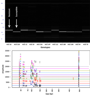 Sclerotinia blight, caused by soil-borne fungus Sclerotinia minor Jagger, is one of the destructive diseases in groundnut. Pathogen affected plants usually displays lesions, wilt and collapse which cause high yield losses. Traditional field screening is time and resources consuming. Molecular markers associated with resistance genes offer an alternative selection technique which is relatively easy, more definite and not influenced by environmental fluctuations. In the present investigation, a marker-assisted diagnosis was done to screen 256 diverse germplasm for the presence or absence of SSR markers reported resistance or susceptibility to sclerotinia blight. One hundred and forty two genotypes from different botanical varieties were recognized as new potential sources of resistance to sclerotinia blight for field evaluation. The banding pattern related to the disease resistance is observed at high frequency in the variety vulgaris (39.4 %) and less distributed in the varieties fastigiata (38.0 %) and hypogaea (19.7 %) among the resistant genotypes in the collection. These genotypes had same banding pattern as reported for resistance germplasm. This work reports the successful application of marker-assisted diagnosis as a tool to identify resistance to sclerotinia blight in diverse collections.