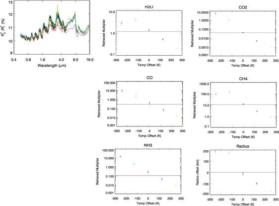 | Is there an atmosphere? | Featureless spectrum over a broad wavelength range or not | Transit spectra at multiple λ (IR in particular) to constrain the scale height. Thermal phase variations. | Chemical Census | |