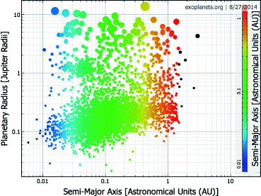 Currently known exoplanets, plotted as a function of distance to the star and planetary radii (courtesy of exoplanets.org). The graph suggests a continuous distribution of planetary sizes – from sub-Earths to super-Jupiters– and planetary temperatures than span two orders of magnitude