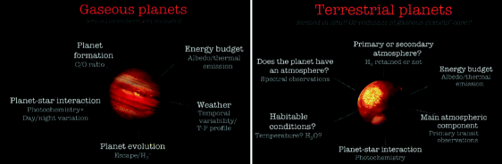 | Science objectives | • Detection of planetary atmospheres, their composition and structure • Determine vertical and horizontal temperature structure and their diurnal and seasonal variations • Identify chemical processes at work (thermochemistry, photochemistry, transport quenching) • Constrain planetary interiors (breaking the radius-mass degeneracy) • Quantify the energy budget (albedo, effective temperature) • Constrain formation and evolution models (evidence for migration) • Detect secondary atmospheres around terrestrial planets (evolution) • Investigate the impact of stellar and planetary environment on exoplanet properties |
