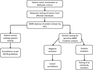 Umar A, Boland CR, Terdiman JP, Syngal S, de la Chapelle A, Ruschoff J, Fishel R, Lindor NM, Burgart LJ, Hamelin R, Hamilton SR, Hiatt RA, Jass J, Lindblom A, Lynch HT, Peltomaki P, Ramsey SD, Rodriguez-Bigas MA, Vasen HF, Hawk ET, Barrett JC, Freedman AN, Srivastava S (2004) Revised Bethesda guidelines for hereditary nonpolyposis colorectal cancer (Lynch syndrome) and microsatellite instability. J Natl Cancer Inst 96(4):261–268