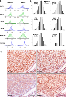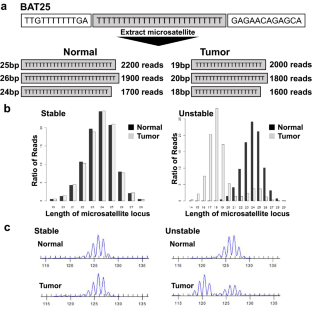 Microsatellite instability (MSI) is an effective biomarker for diagnosing Lynch syndrome (LS) and predicting the responsiveness of cancer therapy. MSI testing is conventionally performed by capillary electrophoresis, and MSI status is judged by visual assessment of allele size change. Here, we attempted to develop a quantitative evaluation model of MSI using next-generation sequencing (NGS). Microsatellite markers were analyzed in tumor and non-tumor tissues of colorectal cancer patients by NGS after a single multiplex polymerase chain reaction amplification. The read counts corresponding to microsatellite loci lengths were calculated independently of mapping against a reference genome, and their distribution was digitized by weighted mean. Weighted mean differences between tumor and non-tumor samples with different MSI status were assessed, and cut-off values for each marker in the discovery cohort were determined. Each microsatellite maker was defined as unstable if the weighted mean difference was greater than the cut-off value. In the discovery cohort, the evaluation model demonstrated sensitivity and specificity of 100% for all markers. In the validation cohort, MSI status determined by the new model was consistent with the outcome of the conventional method in 29/30 cases (97%). The single inconsistent case was classified as low-frequency MSI by the conventional method but considered MSI-high by NGS. Genetic testing for mismatch repair genes revealed a pathogenic variant in MSH6 in the discordant case. We successfully developed a quantitative evaluation method for determining MSI status using NGS. This is a robust and sensitive method and could improve LS diagnosis.
