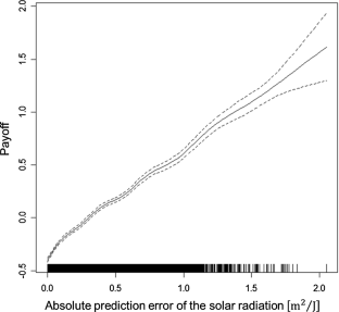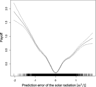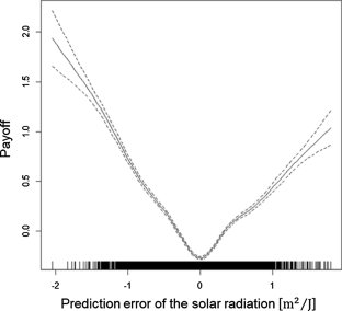 The solar radiation derivative is assumed to be contracted without transaction costs, that is, it satisfies the equation \( {\text{Mean}}\left[ {\psi \left( {\varepsilon_{R,n} } \right)} \right] = 0 \). Note that we assume the same condition for the solar radiation derivative on absolute prediction errors \( \psi \left( {\left| {\varepsilon_{R,n} } \right|} \right) \), which will be introduced later.