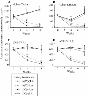 Effects of dietary α-lipoic acid (LA) and ascorbic acid (AA) on the growth, tissue vitamin C and tocopherol (vitamin E) levels, and malondialdehyde levels were examined in the tropical fish pacu, Piaractus mesopotamicus. Pacu juveniles were fed one of four casein-gelatin-based diets for 8 weeks: with 0.05% AA and 0.1% LA (+AA+LA), with AA and without LA (+AA–LA), without AA and with LA (−AA+LA), and without AA and LA (−AA−LA). When the fish received quantities of feed equal to 1.9–2.5% of its body weight, growth was not influenced, regardless of the presence of AA or LA throughout most of the experimental period. Growth was, however, slightly but significantly lower at week 8 in the AA-deficient/LA-supplemented group. An AA-deficient diet caused a highly significant reduction in both total AA and dehydroascorbic acid content in the liver and gill tissues. This reduction of tissue AA concentrations was reversed in a significant manner by LA (antioxidant-sparing effect). The 8-week-long vitamin C deprivation was sufficient to initiate the reduction in tissue ascorbic acid; however, total ascorbate in the liver of fish in the (−)AA/(+)LA group was 127.7±54.3 nmol g−1 tissue, whereas it was 28.6±26.3 nmol g−1 in the (−)AA/(−)LA group, a 4.4-fold difference. This mitigating effect of the addition of the endogenous antioxidant LA to the diet indicates that LA exerts a vitamin C-sparing effect in teleost fish that by far exceeds the phenomena demonstrated in non-scurvy-prone mammals. There was no difference among the different diet groups for vitamin E and malondialdehyde levels in the liver. These results suggest that LA is a potent substance for the prevention of AA deficiency in cultured fishes. The optimal dietary level of LA needs to be determined in the light of the slight reduction in body weight gain after 8 weeks of feeding in the absence of AA.