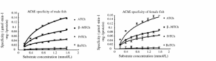 The substrate specificity of brain acetylcholinesterase (AChE) in adult Carassius auratus fish and its sensitivity to carbamate insecticides were investigated in vitro. The results showed that the order of four substrates hydrolyzed by brain AChE in C. auratus was acetylthiocholine iodide > β-methylthiocholine iodide > propionylthiocholine iodide > butyrylthiocholine iodide, and the maximum velocity (V max) of AChE hydrolyzing acetylthiocholine iodide (ATCh) was the highest among the four substrates, and the V max values were 0.067 and 0.082 mmol min−1 mg−1 for male and female fish respectively. But their Michaelis–Menten constants (K m) were the lowest, only 0.071 and 0.072 mmol/l respectively. Compared with other carbamate insecticides, the sensitivity of brain AChE to carbofuran was the highest and the IC50 values were 1.04 × 10−6 mol/l for females and 1.17 × 10−6 mol/l for males. The inhibitory tendencies of eserine, methomyl, and aldicarb to brain AChE were very similar, and the percentage inhibition increased with time at the concentration of 1 × 10−6 mol/l. The order of inhibition potential of the three inhibitors from the highest to the lowest was eserine, aldicarb, and methomyl.