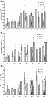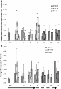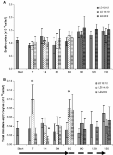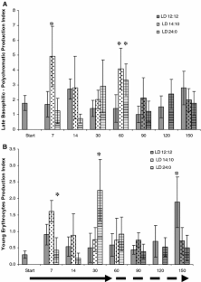 Haematological parameters are often used as health status and stress indicators in fish. However, information on the effects of artificial photoperiods on these parameters is scarce and ambiguous. The consequences of three different artificial photoperiod regimes [light/day 12 h:12 h (LD 12:12) for 150 days as controls; LD 14:10 and LD 24:0, both for an initial 60 days, and then LD 12:12 for the remaining 90 days] were evaluated in trout. In all fish the haemogram and the erythrocyte production index (EPI) were assessed at days 7, 14, 30 and 60 (phase 1) and at days 90, 120 and 150 (phase 2). At the end of phase 1, photoperiods LD 14:10 and 24:0 induced higher production of immature (late basophilic) erythrocytes (0.06–0.08 × 1012 cells/l, P < 0.05) and elevated EPI (young erythrocytes = 1.6 in LD 14:10, 2.25 in LD 24:0; late basophilic erythrocytes = 4.1–4.9 in LD 14:10, 3.3 in LD 24:0) than in controls (late basophilic erythrocytes = 0.02–0.04 × 1012 cells/l; EPI young erythrocytes = 0.2–1.0; EPI late basophilic erythrocytes = 1.4–2.7). During phase 2, only reduced numbers of lymphocytes and thrombocytes were observed at day 150 in the LD 14:00 group. An increase in the EPI (1.9) of control young erythrocytes was found at day 150.