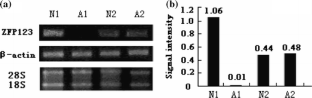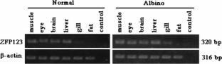 A novel zinc finger protein (ZFP) gene of the Japanese flounder, Paralichthys olicaceus, has been isolated by differential mRNA display (DD). This technique was utilized to simultaneously compare the mRNA transcript populations from pigmented skins of the ocular side of normal Japanese flounder (termed N1 skin) and non-pigmented skins of the ocular side of albino Japanese flounder (termed A1 skin). A reproducibly differentially expressed band was isolated and cloned from N1 skin tissue. The isolated 917-bp DD fragment (termed EST917) was screened and sequenced. Sequence analysis of EST917 revealed that it contains a complete open reading frame and encodes a polypeptide of 123 amino acids (named ZFP123), with a predicted molecular weight of 13.293 kDa. Expression profile analysis by a reverse transcription-PCR (RT-PCR) technique revealed the expression of the ZFP123 gene in N1 skin and its lack of expression in A1 skin; it was expressed, however, in both blind sides of normal Japanese flounder (termed N2 skin) and the blind side of albino Japanese flounder (termed A2 skin) in a very similar manner. ZFP123 mRNA was found to be highly expressed in muscle, eye, brain and liver, but weakly expressed or undetectable in the gill and fat in both normal and albino Japanese flounders. The ZFP123 of the Japanese flounder shows a high homology to those ZFPs of other species, and the phylogenetic relationship among 14 sequences isolated from other species are illustrated.