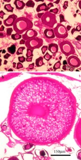 The gonad histology, gonado-somatic index (GSI), 17β-estradiol (E2) levels and acetylcholinesterase (AChE) activity in the carp species Chalcalburnus tarichi from Lake Van and the Karasu river, eastern Turkey, have been investigated. Fish between 5 and 7 years old were sampled from November 2003 to February 2004. The ratio of female fish caught in Lake Van with abnormal ovaries (AbOF) was 43.3%, but the fork length and body weight of these fish were not correlated with this abnormality. The weight of the ovaries and the GSI values of AbOF were very low (P < 0.05). Histological observations on the samples caught each month revealed that the oocytes had degenerated in the perinucleolus and early cortical alveolus stages and that the ovaries were full of somatic stromal tissue. In addition, the seminiferous tubules of male fish with abnormal testes did not contain male reproductive cells at any stage. The ovaries of the fish caught from the Karasu river were also full of oocytes in the perinucleolus and early cortical alveolus stages, but there were fewer atretic follicles. Furthermore, apoptosis was observed in the ovary cells of these fish, in particular in the follicular cells, and the plasma E2 levels of the AbOF was very low (P < 0.05). AChE activity was inhibited only in liver (P < 0.05). We conclude that our sample of C. tarichi must have been exposed to various polluting chemicals or another unknown factors (such as global warming) and that these factors have irreversibly impaired oocyte development in a high percentage of fish.