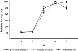 The digestive enzyme activities of Pacific bluefin tuna Thunnus orientalis were evaluated for specific activity and characterized for pH and temperature optima in crude extracts of stomach, caecal mass, and proximal, middle and distal intestine. A higher level of alkaline proteolytic activity was detected in the caecal mass than in the proximal intestine. Total alkaline proteases, trypsin, chymotrypsin and leucine aminopeptidase (LAP) were tested. The temperature and pH analyses showed that proteolytic activity as well as lipase were maximal in the alkaline range, with a maximum at pH 9.0 and at temperatures between 35 and 60°C, except for the pepsin, which showed maximum activity at the same temperatures but in the acid range (pH 3.0). The α-amylase activity showed a broader range in activity, both for pH and temperature, with higher activity over the alkaline pH values and higher temperature. The lipase activity seems to be nondependent on bile salts under our assay conditions, resulting in a significant activity reduction in the presence of bile salts. This knowledge will allow the development of a gastrointestinal model (everted intestine) where food or feed will be hydrolysed with the fish’s own enzymes, a project that is being undertaken in our laboratory as a contribution to the development of novel diets for tuna fish.