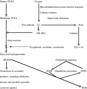 Fish are a rich source of the n-3 polyunsaturated fatty acids (PUFA), particularly the highly unsaturated fatty acids (HUFA) eicosapentaenoic (EPA; 20:5n-3) and docosahexaenoic (DHA; 22:6n-3) acids, which are vital constituents for cell membrane structure and function, but which are also highly susceptible to attack by oxygen and other organic radicals. Resultant damage to PUFA in membrane phospholipids can have serious consequences for cell membrane structure and function, with potential pathological effects on cells and tissues. Physiological antioxidant protection involves both endogenous components, such as free-radical-scavenging enzymes, and exogenous dietary micronutrients including tocopherols and tocotrienols, the vitamin E-type compounds widely regarded as the primary lipid-soluble antioxidants. The antioxidant activities of tocopherols are imparted by their ability to donate their phenolic hydrogen atoms to lipid (fatty acid) free radicals, resulting in the stabilization of the latter and the termination of the lipid peroxidation chain reaction. However, tocopherols can also prevent PUFA peroxidation by acting as quenchers of singlet oxygen. Recent studies on marine fish have shown correlations between dietary and tissue PUFA/tocopherol ratios and incidence of lipid peroxidation, as indicated by the levels of thiobarbituric-acid reactive substances (TBARS) and isoprostanes. These studies also showed that feeding diets containing oxidized oil significantly affected the activities of liver antioxidant defence enzymes and that dietary tocopherol partially attenuated these effects. However, there is evidence that dietary tocopherols can affect fatty acid metabolism in other ways. An increase in membrane PUFA was observed in rats deficient in vitamin E. This was suggested to be due to overproduction of PUFA arising from increased activity of the desaturation/elongation mechanisms responsible for the synthesis of PUFA. Consistent with this, increased desaturation of 18:3n-3 and 20:5n-3 in hepatocytes from salmon fed diets deficient in tocopherol and/or astaxanthin has been observed. Although the mechanism is unclear, tocopherols may influence the biosynthesis of n-3PUFA through alteration of cellular oxidation potential or peroxide tone.