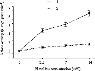 The subject of acute injury, apoptosis and canceration of animals induced by heavy metal ions has been one of the hotspots studied worldwide. However, the exact molecular mechanism of Cd-induced carcinogenicity remains largely unclear, and how to relieve the toxicity in vivo has rarely been reported. For this paper, we have investigated the mechanism of Cd2+ on DNA cleavage and Ca2+ on DNA repair in the liver of silver crucian carp (Carassius auratus gibelio) by agarose gel electrophoresis methods and by estimating biochemical indexes. Our results show that Cd2+ induces the classical laddering degradation of DNA in vivo and that DNA cleavage is repaired after injection with Ca2+ under various Cd2+ concentrations. DNA cleavage caused by Cd2+ is due to the activation of deoxyribonuclease (DNase) and the accumulation of reactive oxygen species (ROS). Furthermore, Cd2+ destroys the antioxidant system, which diminishes the activities of superoxide dismutase (SOD), catalase (CAT) and peroxidase (POD), causing an increase of the lipid peroxidation (LPO) level, respectively. However, after the liver is injected with Ca2+ under various Cd2+ concentrations, the DNase activity, the ROS generating rate and the LPO level are obviously reduced, the activities of SOD, CAT, and POD are greatly increased. At the same time, ROS production and removal recoves its balance. The results show that Ca2+ can relieve the toxicity of Cd2+ in silver crucian carp.