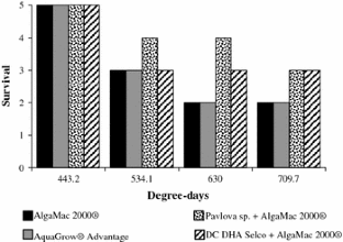 Considerable progress has been achieved in the intensive culture of Atlantic cod (Gadus morhua). However, there is little information concerning optimum live-feed enrichments for cod larvae, since many of the techniques used during the larviculture have been borrowed from other fish species and adapted for the production of Atlantic cod. The present study compared four different protocols for the enrichment of Artemia to be used as live feed for cod larvae. The protocols tested were: (1) AlgaMac 2000, (2) AquaGrow Advantage, (3) Pavlova sp. + AlgaMac 2000, and (4) DC DHA Selco + AlgaMac 2000. Larvae were fed differently enriched Artemia between 37 and 59 days post hatch. At the end of the experiment, larvae from treatment 1 [specific growth rate (SGR) = 10.4 ± 0.4% day−1] grew faster than larvae from treatments 3 (SGR = 6.9 ± 0.2% day−1) and 4 (SGR = 4.9 ± 0.4% day−1, P < 0.0001). However, treatments 3 and 4 resulted in better larval survival at the end of the experimental period, estimated to be 3 on a scale from 1 to 5, whereas the survival estimates for the two other groups were 2. The treatments affected the fatty-acid composition of Artemia and of cod larvae. Larvae from treatment 1 had a higher percentage of AA (20:4ω6, P < 0.0001) and ω6DPA (22:5ω6, P < 0.0001) than the other larvae. Levels of DHA (22:6ω3) were similar in larvae from treatments 1 and 4, and higher than in the other larvae (P < 0.0001). Our results suggest that Artemia containing a DHA/EPA/AA ratio of 7/2/1 result in good larval performance.