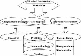 Aquaculture has evolved as the fastest growing food-producing sector and developed as an important component in food security. To keep a sustainable growth pattern, health management strategies must go beyond antibiotics and chemotherapeutics, which create resistant bacteria and immunosuppression in the host. Besides development of drug resistant bacteria and pathogens, the adverse effect of antibiotics is caused by their influence on the aquatic microflora, and the retention of harmful residues in aquatic animals. On the other hand, the microbes with their unique structure and cell wall components can trigger immunity, and thus exposure plays an important role in the evolution. Microbial intervention through an environmentally friendly approach is an alternative method of health management. India is endowed with a bounty of varied climatic conditions, microbial diversity and fish fauna and aquaculture systems offering challenges in biological and environmental pursuits. Producing about 4.4% of world’s fish and ranking third in global fish production, India trades about 2.4% in global fish market with the annual export earning being over $1311 million. Use of microbes for beneficial purposes is increasingly recognized as a valuable input for sustainable and responsible aquaculture. Microbial intervention in aquaculture can be broadly water/environment based through bioaugmentation, biostimulation, biocontrol measures, or (to generate) host response through probiotics, immunostimulants, and vaccines. Also, application of molecular methods such as polymerase chain reaction (PCR) and nucleic acid techniques are making increasing inroads into aquatic microbiological research in India. This paper elucidates all these aspects of microbial intervention in aquaculture, high-lighting Indian research and accomplishments.