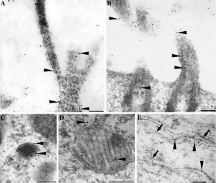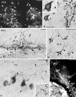 Ultrastructural localization of neuronal nitric oxide synthase (nNOS) in olfactory receptor neurons (ORNs) and immunohistochemical detection of the enzyme in forebrain, pituitary, and pineal were undertaken in the teleost Oreochromis mossambicus. Application of post-embedding immunoelectron microscopy revealed nNOS-labeled gold particles on the cilia, microvilli, mitochondria, and Golgi complex of the ORNs. Gold particles were also seen adhered to microtubules in the axons that extend to the olfactory nerve layer in the olfactory bulb. With light microscopy, nNOS-immunoreactive neurons were seen in preoptic area, nucleus entopeduncularis, and parvocellular, and magnocellular subdivisions of nucleus preopticus (NPO). Numerous cerebrospinal fluid-contacting cells lining the wall of the third ventricle at the level of the NPO showed intense immunoreactivity. Intense to moderate immunoreactivity was observed in the neurons of suprachiasmatic nucleus, nucleus lateralis tuberis pars lateralis, and nucleus recessus lateralis. While several immunoreactive fibers were detected in medial olfactory tract, suprachiasmatic area, and hypothalamo-hypophyseal tract, a few were seen throughout the telencephalon, in the optic chiasma, tuberal area, and inferior lobes. In the pituitary, nNOS-containing fibers were seen in the neurohypophysis, rostral pars distalis, proximal pars distalis, and pars intermedia. While intense immunoreactivity was noticed in some cells in the pineal, immunoreactive fibers were detected in the pineal stalk as well as parenchyma. We suggest that nitric oxide may play a role in processing olfactory and photic information, circadian rhythms, and neuroendocrine regulation in tilapia.