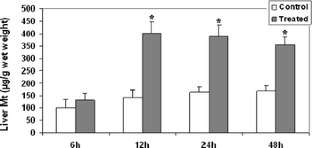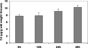 This research was designed to study Sparus aurata (sea bream) biotransformation and detoxification responses to acute exposure to cadmium (Cd). Sexually immature gilthead sea bream were treated by intraperitoneal injection of Cd chloride (200 μg kg−1) for 6, 12, 24 and 48 h. Cd accumulation was quantified in sea bream liver by graphite furnace atomic absorption spectroscopy after the various exposure periods. The following biological responses were measured: (1) ethoxyresorufin-O-deethylase (EROD) activity as phase I biotransformation parameter, (2) liver glutathione-S-transferase (GST) activity as a phase II conjugation enzyme and metallothionein (MT) content as specific response to Cd contamination. Cd bioaccumulation in the liver resulted in an increasing uptake up to 10.3 μg g−1 wet weight after 48 h of exposure. EROD showed a significant activation only after 6 h exposure and a return to control levels after 12 h. GST revealed significant activation starting from 12 h exposure. MT accumulation in liver showed the same behavior as GST activation.