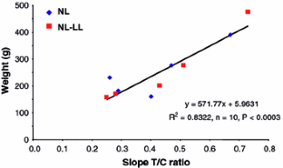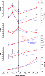 This study comprised the results of three different seawater trials using unique combination of techniques to study protease digestive efficiency and growth performance quality to illustrate the effects of light regimes and vaccine types in Atlantic salmon (Salmo salar L.). Fish with higher growth had higher trypsin (T) and chymotrypsin (C) specific activities with higher T/C ratio or slope T/C ratio [calculated from the regression between trypsin (y) and chymotrypsin (x) specific activities] in the pyloric caeca. The T/C ratios indicated fish growth rates over a period of 1–2 months, while the slope T/C ratios indicated fish growth rates at sampling. Adaptation period for adjustment to the new environment of continuous light was 70 days, indicated by the differences in trypsin specific activities and the crossing of slope T/C ratio regressions following with the changes in growth rate directions between the control and the treated group. Vaccine types affected fish vertebral growth, and additional continuous light enhanced the impact of vaccines on fish growth during springtime, indicated by differences in slope T/C ratios. Continuous light stimulated fish growth during winter to spring, when the natural day length was short, without significantly changing white muscle and oocyte qualities in the fish of about 500 g, except for significantly increased white muscle RNA concentration. Continuous light also reduced fish growth rate later during summer, when the natural day length was long, by precedently decreasing the T/C ratio in late spring. Interestingly, plasma levels of free lysine related to tryptic digestion were correlated with trypsin specific activity levels. Continuous light caused higher levels of most free amino acids (FAA) involved in nitrogen metabolism, higher incorporation of essential FAA for protein synthesis, and higher protein turnover rate (free hydroxyproline levels) in both plasma and white muscle. However, continuous light did not affect higher protein content, intracellular buffering capacity and RNA levels in the white muscle of the fish of about 1 kg, probably due to limitation of FAA available for protein synthesis. It is therefore suggested that enhancing fish growth by continuous light stimulation should be accompanied by increasing availability or content of dietary protein (and probably minerals), which in turn would improve the quality of fish growth performance through increasing fillet protein concentration, strengthening vertebral growth, and delaying oocyte development.