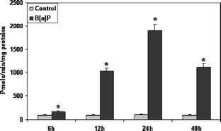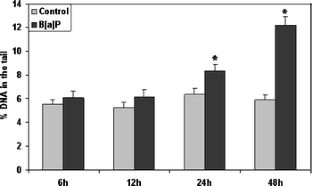 In the present study biotransformation and detoxification responses to acute exposure to the polycyclic aromatic hydrocarbons benzo[a]pyrene (B[a]P) were investigated in the liver of Sparus aurata (sea bream). Sexually immature gilthead sea bream were treated by intraperitoneal injection of B[a]P (20 mg kg−1) for 6, 12, 24, and 48 h. B[a]P accumulation was quantified in sea bream liver by mean of gas phase chromatography (GPC-MS) after the various exposure periods. The following biological responses were measured: (1) ethoxyresorufin-O-deethylase (EROD) activity, as a phase I biotransformation parameter; (2) liver glutathione S-transferase (GST) activity as a phase II conjugation enzyme. DNA damage was assessed over time using the single-cell gel electrophoresis comet assay. B[a]P bioaccumulation in the liver resulted in a biphasic curve with an increasing uptake up to 5.55 ± 0.67 μg g−1 dry weight after only 6 h exposure and 4.67 ± 0.68 μg g−1 dry weight after 48 h exposure. EROD activity showed a nonsymmetrical bell-shaped kinetic with a maximum at 24 h and lower but significant activities at 12 and 48 h with respect to control animals. Hepatic GST activities were only significant after 48 h exposure. Comet assay showed an increase in liver cells DNA damage with a maximum after 48 h exposure reaching up to 12.17 %DNA in the tail.