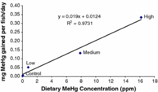 Recently, there have been reports of increasing amounts of mercury (Hg) in muscles of beluga (Huso huso, Brandet 1869) in the Caspian Sea which exceeds its guideline level for food in the UK. Our intensive effort was to investigate the effects of dietary methylmercury (MeHg) on Beluga bioenergetics. Beluga juveniles were fed with four diets containing MeHg (control: 0.04 mg kg−1; low: 0.76 mg kg−1; medium: 7.88 mg kg−1; and high: 16.22 mg kg−1) for 70 days. There were significant differences in food consumption among the treatment groups. After 42 days, all individuals of the high dose died. After 35 and 70 days, all treatment groups (low, medium and high) showed a significant decline in their growth rate, unlike the control group. They also showed considerable lower specific growth rates (SGR) comparing to the control group. All treatment groups assimilated the dietary MeHg into their muscle tissue in a dose-dependent manner. Assimilation percent was significant among the treatment groups at days 35 and 70, but it was lower in the first 35 days than in the second 35 days. The data obtained from the dietary MeHg concentration and bioaccumulation rates were modeled for better natural resources management of the Caspian Sea.