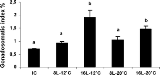 In this study we examined the endocrine mediation between environmental factors (temperature and photoperiod) and the brain–pituitary–gonadal axis in females of pejerrey Odontesthes bonariensis. Changes in the expression of brain gonadotropin-releasing hormones (GnRHs) and gonadotropin (GtH) subunit [follicle stimulating-β (FSH-β), luteinizing hormone-β (LH-β), glycoprotein hormone-α (GPH-α)] genes, plasma gonadal steroids [estradiol (E2) and testosterone (T)], gonadal histology, and gonadosomatic index (GSI) in adult females exposed to combinations of short-day (8 h) or long-day (16 h) photoperiods and low (12°C) or high (20°C) temperatures after winter conditions (8 h light, 12°C) were analyzed. Pejerrey females kept under the short photoperiod had low GSIs, and their ovaries contained only previtellogenic oocytes regardless of the experimental temperature. In contrast, females exposed to the long photoperiod had high GSIs and ovaries with vitellogenic oocytes at both temperatures. These fish also showed a significantly higher expression of sGnRH, pjGnRH, cGnRH-II (the three different GnRH variants found to date in the pejerrey brain), FSH-β, LH-β and GPH-α genes and plasma E2 levels than those at the shorter photoperiod. No significant changes were observed in plasma T levels. Based on these results, we concluded that the increase in day length but not that of temperature triggers the maturation of pejerrey females after the winter period of gonadal rest and that this occurs by an integrated stimulation of the various components of the brain–pituitary–gonad axis.