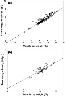 Craig JF, Kenley MJ, Talling JF (1978) Comparative estimations of the energy content of fish tissue from bomb calorimetry, wet oxidation and proximate analysis. Freshw Biol 8:585–590