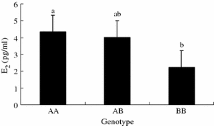 Cytochrome P450 aromatase, which is encoded by the CYP19a gene, converts androgens to estradiol. Considerable evidence suggests that estrogens play an important role in fish reproductive process. Therefore CYP19a is an excellent candidate gene for reproductive traits. Variants in the promoter of the CYP19a gene might also be involved in the control of aromatase expression and affect regulatory mechanism linking cholesterol metabolism to the synthesis of sex steroids. In this study, nine single-nucleotide polymorphisms (SNPs) were detected with polymerase chain reaction-single stranded conformational polymorphism (PCR-SSCP), namely A-680G, G-672A, AGTAGT-649 inserting or deleting, T-623C, C-410A, T7-454A, T-402C, TTTCCAGACTGA-345 inserting or deleting, and G-297C. Nine SNPs within the promoter of the CYP19a gene were tested for association with four reproductive traits [serum testosterone (T), serum 17β-estradiol (E2), hepatosomatic index (HSI), and gonadosomatic index (GSI)] in a population of 50 female Japanese flounder individuals. A locus, P3 (TTTCCAGACTGA-345 inserting or deleting, G-297C), was significantly associated with 17β-estradiol (E2) level (P < 0.05) in female Japanese flounder. In addition, there was significant association between one diplotype based on nine SNPs and reproductive trait. The genetic effect for E2 level of diplotype D3 was significantly higher than those of other diplotypes (P < 0.05). Results indicate that these genetic effects of those variants on E2 level may help to explain CYP19a gene status in the reproductive endocrinology of Japanese flounder.