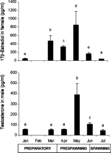 Tveiten H, Johnsen HK (2001) Thermal influences on temporal changes in plasma testosterone and oestradiol-17β concentrations during gonadal recrudescence in female common wolfish. J Fish Biol 59:175–178