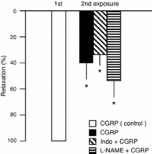 The presence and vasoactive effects of native calcitonin gene-related peptide (CGRP), substance P (SP), and neurokinin A (NKA) were studied on isolated small branches of the coeliac artery from Atlantic cod, Gadus morhua, using immunohistochemistry and myograph recordings, respectively. Immunohistochemistry revealed nerve fibers containing CGRP- and SP/NKA-like material running along the wall of the arteries. CGRP induced vasorelaxation of precontracted arteries with a pD2 value of 8.54 ± 0.17. Relaxation to CGRP (10−8 M) was unaffected by l-NAME (3 × 10−4 M) and indomethacin (10−6 M) suggesting no involvement of nitric oxide or prostaglandins in the CGRP-induced relaxation. SP and NKA (from 10−10 to 3 × 10−7 M) contracted the unstimulated arteries at concentrations from 10−8 M and above in 42% and 33%, respectively, of the vessels. It is concluded that the innervation of the cod celiac artery includes nerves expressing CGRP-like and tachykinin-like material, and that a vasodilatory response to CGRP is highly conserved amongst vertebrates while the response to tachykinins is more variable.
