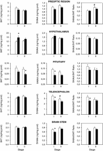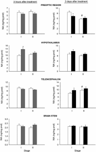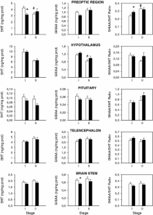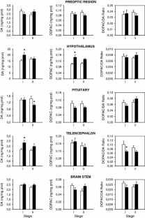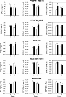 The contents of dopamine (DA), noradrenaline (NA), serotonin (5HT), and some related metabolites were studied in different brain regions of rainbow trout at two different stages of sexual maturation (at the beginning of vitellogenesis), after naphthalene (NAP) administration. The effects of NAP varied according to duration of exposure, brain region and vitellogenesis stage of the trout, and were more significant during previtellogenesis. The changes observed in DA metabolism were generally stimulatory after exposure for 3 h, and either stimulatory or inhibitory (depending on the brain regions) after exposure for 3 days to NAP. NA levels were altered by NAP in various brain regions, but only during previtellogenesis. With respect to 5HT, treatment with NAP reduced levels of the amine and/or its main metabolite in most of the brain regions studied, particularly 3 h after treatment. The results suggest that NAP might interfere with the processes regulating brain monoamine metabolism, either locally or indirectly by altering steroid feedback to brain centres, and thus disrupt endocrine control of reproductive development through the brain–pituitary axis.