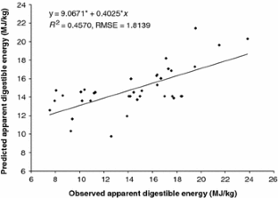 In an attempt to develop predictive relationships, apparent digestible energy (ADE) content (n = 361) as biological dependent variable and dietary contents of crude protein (CP), lipid, ash and gross energy (GE) as independent variables, obtained in 40 studies with 65 different feed ingredients and evaluated with 26 fish species, were subjected to linear correlation and multiple linear regression analysis. With dietary CP and GE contents identified as significant predictors, only 58% of the variation in ADE content could be explained. No improvement in accuracy of regression equations was gained by classification of values according to either feed ingredient (animal proteins, plant proteins, cereals) or fish species (water type, water temperature, feed habit). An R 2-value of 0.4570 and mean prediction error (MPE) of 0.2085 between predicted and observed ADE values from eight independent studies (n = 37) illustrated the inability of the derived regression equation to accurately predict ADE contents of feed ingredients. Inclusion of dietary crude fibre and nitrogen-free extract (NFE) contents as independent variables did not improve the accuracy of prediction equations. The inadequacy of the use of linear regression to predict DE content from dietary composition across feed ingredients and fish species with high accuracy is discussed.