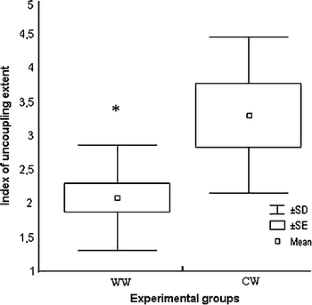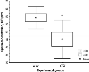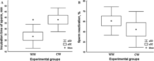 Concentration, ability to motility, motility during the second activation (reactivation), and endogenous respiration were studied in sperm from two experimental groups of carp males. Group 1 was maintained for 7 days at 15°C (cold water (CW) group), whereas the second group was subjected to a temperature of 20°C (warm water (WW) group) before sperm sampling. Reactivation were achieved after incubation of firstly activated sperm in media with osmotic pressure adjusted up to 300 mOsm*kg−1 by increasing K+ concentration. Statistically significant reduction of spermatozoa concentration in CW samples versus WW (from 46.0 ± 12.5 (15°C) to 59.3 ± 7 109 (20°C) spermatozoa /ml) have been observed. The sperm of the CW group required a significantly longer incubation time (37 min) under isotonic conditions to achieve a maximum percentage of potent motility at repeated activation than the WW group (23 min). After activation of sperm motility, an increase of respiration rate up to maximum level has been found, this level remained the same under condition of recovering the potential to repeated activation. During the sperm movement respiration rate, in CW group (6.1 nmolO2/min/109spermatozoa) and WW (3.9 nmolO2/min/109spermatozoa), was significant higher compared to nonactivated sperm (2.4 nmolO2/min/109spermatozoa for CW and 1.1 nmolO2 /min/109spermatozoa for WW). And keeping males for 7 days at 15°C increase the respiration rate of sperm.