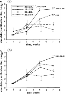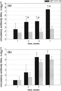 Males of two strains of carp, wild Duna (D), and inbred Szarvas 22 (22), were selected for high and low stress response. Two purebreds of D and 22, from randomly chosen parents and four crosses, 22 × 22-L (low stress response), 22 × 22-H (high stress response), 22 × D-L (low stress response) and 22 × D-H (high stress response) from selected stress response parents were produced and vaccinated with a commercial Aeromonas salmonicida/Aeromonas hydrophila vaccine and their circulating antibody response evaluated 1, 3, 5, and 7 weeks post-vaccination by ELISA. Significantly higher titres of circulatory antibodies against A. hydrophila were found in the families 22 and cross 22 × 22-L compared to other groups. The development of circulatory antibodies against A. hydrophila in all crosses having at least one D parent was low and remained low throughout the experiment. The level of circulatory antibodies against atypical A. salmonicida in the inbred strain increased following a booster vaccination with the highest values measured in inbred strain 22 and cross 22 × 22 L. The different varieties of carp had different levels of survival against experimental challenge with A. hydrophila. The greatest survival was obtained in strain 22 and cross 22 × 22-L, while ~90% of D wild carp and cross 22 × D (independent of their stress response) died. Survival results correlated well with the antibody response of the different groups: 22 and 22 × 22-L had the highest antibody titres against A. hydrophila and the greatest level of survival.