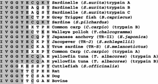 Sekizaki H, Itoh K, Murakami M, Toyota E, Tanizawa K (2000) Anionic trypsin from chum salmon: activity with p-aminophenyl ester and comparison with bovine and Streptomyces griseus trypsins. Comp Biochem Physiol 127B:337–346