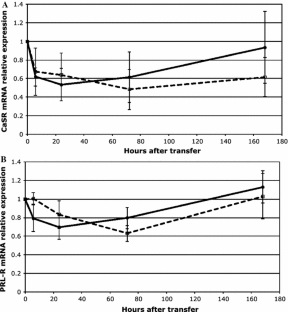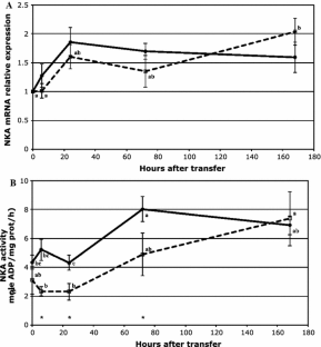 The physiological response of Mozambique and Nile tilapia transferred from fresh to brackish (15 ppt) water was compared during a one-week time course. Response in the pituitary was measured by the gene expression pattern of prolactin (PRL I), growth hormone (GH), and calcium-sensing receptor (CaSR), while the response in the gills was measured by the gene expression pattern of the prolactin receptor (PRL-R), Na+/K+/2Cl− cotransporter (NKCC) and Na+/Cl− cotransporter (NCC), and by activity and expression of Na+/K+-ATPase (NKA). The time-course curves of plasma osmolality levels indicate a rapid elevation 24 h after transfer, which later decreased and maintained at stable level. PRL I expression decreased in both species, but with stronger response in the Nile tilapia, while no differences were found in the slightly elevated levels of GH mRNA. The branchial response demonstrated a faster up-regulation of NKA and NKCC in the Mozambique tilapia, but similar levels after a week, while Nile tilapia had stronger and constant down-regulation of NCC. The time-course response of the measured osmoregulatory parameters indicate that 24 h after transfer is a critical time point for brackish-water adaptation. The differences in responses to saltwater challenge between Mozambique and Nile tilapia shown in this study may be associated with the differences in saltwater tolerance between these two tilapiine species.