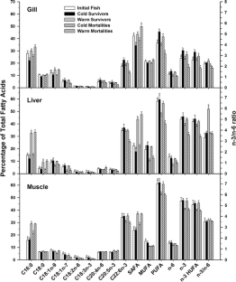 In this study, we examine changes in fatty acid composition of polar and neutral lipids in gill, liver, and muscle of freshwater alewives (Alosa pseudoharengus) after temperature challenges in the laboratory. Alewives experienced either a warm or cold challenge in which temperatures were raised or lowered 0.5°C day−1 over 4–6 weeks. In alewives experiencing the cold challenge, gill polar lipids showed evidence of significant remodeling, including decreases in palmitic acid and saturated fatty acids and increases in n-3 and n-6 highly unsaturated fatty acids including docosahexaenoic acid (DHA) and arachidonic acid. In alewives experiencing the warm challenge, we observed significant increases in saturated fatty acids (due mainly to increased palmitic acid) and decreases in polyunsaturated fatty acids in polar lipids of muscle and liver tissue. Fish that died during the cold challenge had significantly higher levels of palmitic acid in muscle polar lipids compared to fish that survived; fish that died during the warm challenge displayed complex changes in fatty acid composition. Based on theoretical considerations, the changes in polar lipids we observed during thermal acclimation are likely to promote appropriate membrane fluidity under each thermal regime. The increased incorporation of highly unsaturated fatty acids during cold acclimation could have significant physiological and ecological implications. In particular, since highly unsaturated fatty acids are typically scarce in freshwater food webs, dietary deficiencies in these essential fatty acids may be a significant factor in winter mortality of freshwater alewives.