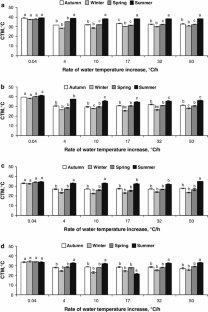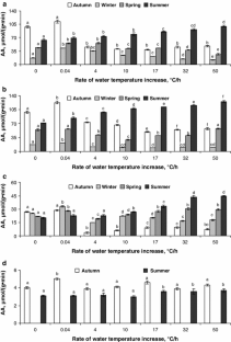 The relationship between the level of the intestinal mucosa amylolytic activity (AA) of juvenile goldfish Carassius auratus, carp Cyprinus carpio, roach Rutilus rutilus and perch Perca fluviatilis and the rate of water temperature increase was studied. Increase in water heating rate significantly influences AA and the level of upper lethal temperatures defined by critical thermal maximum (CTM) during different seasons. At a low rate of water temperature increase, 0.04 °C/h, AA and the level of CTM are maximal during all seasons. More rapid rates of heating, 4–50 °C/h, increase the AA during the summer and usually decrease it by 2- to 7.5-fold during other seasons. Rapid increase in ambient temperature in the autumn–winter period, unnatural for seasonal dynamics, produces a negative impact upon the fish’s carbohydrate hydrolysis rate and thermal resistance.