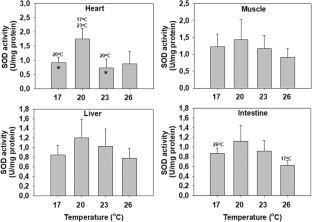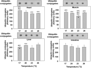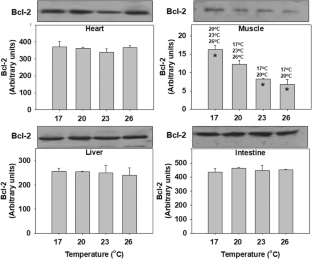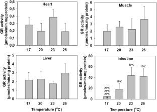 Μeagre (Argyrosomus regius) is a newly introduced species in the aquaculture sector characterized by high growth rates and good nutritional value. However, the optimum conditions such as water temperature for the rearing of this species are still under research. The aim of the present study was to investigate several biochemical responses in the heart, muscle, liver, and intestine of meagre reared under different water temperatures (17, 23, and 26 °C) in comparison to the initial acclimation temperature at 20 °C. To assess its cellular stress response, the molecular markers of Hsp70 and Hsp90 induced levels, p38 MAPK and p44/42 MAPK phosphorylated levels, ubiquitin conjugates, and Bcl-2 levels were determined. Moreover, to investigate its antioxidant defense, the activities of superoxide dismutase, catalase, and glutathione reductase were measured. The obtained results in meagre showed a distinct tissue-specific response regarding the variations observed in the studied parameters under different acclimation temperatures. Specifically, most examined tissues presented a decrease in the levels of the examined markers compared to 20 °C, while in the intestine, an increase of Hsp70 and p38 MAPK levels was observed at 23 and 26 °C. However, data on the final weight and length of the fish lead to the conclusion that high water temperatures such as 26 °C might be the best for the rearing of this species. Therefore, it is assumed that the observed differential molecular responses may act in a cell-protective way at all temperatures, irrespectively of the effect of temperature on growth parameters.