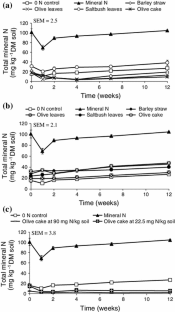 In dry areas, unconventional feeds are increasingly used for mitigating feed shortages and rangeland degradation. We evaluated how feeding sheep diets containing olive leaves, saltbush leaves and olive cake affects manure quality compared to a barley straw based diet. Soil incubation and plant growth experiments were carried out to measure soil nitrogen (N) mineralization and N uptake by barley plants and to calculate N flow through the feed-animal-soil–plant system. Fresh feces, composts consisting of feces, urine and straw, and ammonium sulfate fertilizer were mixed with soil at rate of 90 mg N kg−1 soil dry matter. Comparisons were made with non-amended soils (control) and soils amended with fresh olive cake applied at 90 and 22.5 mg N kg−1 soil dry matter, respectively. The latter treatment enabled investigation of the effect of passage of olive cake through the digestive tract of sheep on N availability and phenol transformation. Applying fresh olive cake and feces, except the saltbush leaf derived feces, resulted in a net N immobilization. All composts resulted in net N mineralization, although not significantly different from the 0N control soil. Barley growing in soils with amendment that caused N immobilization took up less N than barley growing on the 0N treatment. Reduction in N uptake was most pronounced after amendment with fresh-olive cake. Treatments with net mineralization increased barley N uptake over the 0N treatment with 2–16 % of N applied being taken up. Dietary composition had a minor effect on N fertilizer value of either feces or compost, but feces N alone was not an efficient N source.